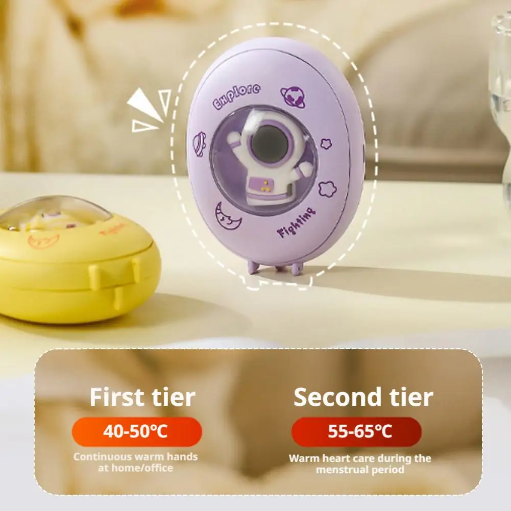 Product Details:Material: ABSColors: Pink, Blue, Purple, YellowProduct Dimensions: 9.6*7.5*4.6CM / 3.77*2.95*1.81 inchesPower Levels: 2Battery Capacity: 1200mAhRated Power: 10WRated Voltage: 5VUsage:1. Short press to activate hand warmer modeLevel 1: 40-50°C (first press, white light), approximately 5 hours of use after a full charge.Level 2: 55-65°C (second press, green light), approximately 2 hours of use after a full charge. (Charging time and number of uses may vary depending on actual usage and temperature.)2. Turn off (third press)3. Press and hold for 3 seconds to activate the gradient seven-color light mode, press again for 3 seconds to turn off the light.4. Red light illuminates during charging, turns off when forfully charged.Product Description:1. Charming design and vibrant colors: This uniquely designed astronaut-themed hand warmer is incredibly cute, allowing you to feel warm even on cold winter days. Available in a variety of vibrant colors including pink, blue, purple, and yellow, this hand warmer not only provides warmth but also serves as a stylish accessory and a perfect gift for any age.2. 3-Second Rapid Heating: This high-efficiency hand warmer quickly dispels the chill. Utilizing advanced technology, it releases warmth in just 3 seconds, providing a continuous, comfortable, and gentle heat, keeping your hands warm and comfortable in the morning or on a cold night.3. Made of Premium ABS Material: This hand warmer boasts a smooth, skin-like texture, providing an extremely comfortable grip. Its compact and portable design easily fits in your palm, pocket, or small bag.4. Multi-functional Ambient Night Light: In addition to its primary hand-warming function, this innovative device also functions as a charming ambient night light. Featuring a captivating seven-color gradient breathing light, it creates a tranquil and peaceful atmosphere, perfect as a cozy bedside lamp or to accompany you to sleep on a cold night.Product includes: 1*Mini Hand WarmerNote: Please allow slight size errors due to manual measurement (12 cm/0.390.78 inches), the actual size received shall prevail; please allow slight color errors under different monitors.