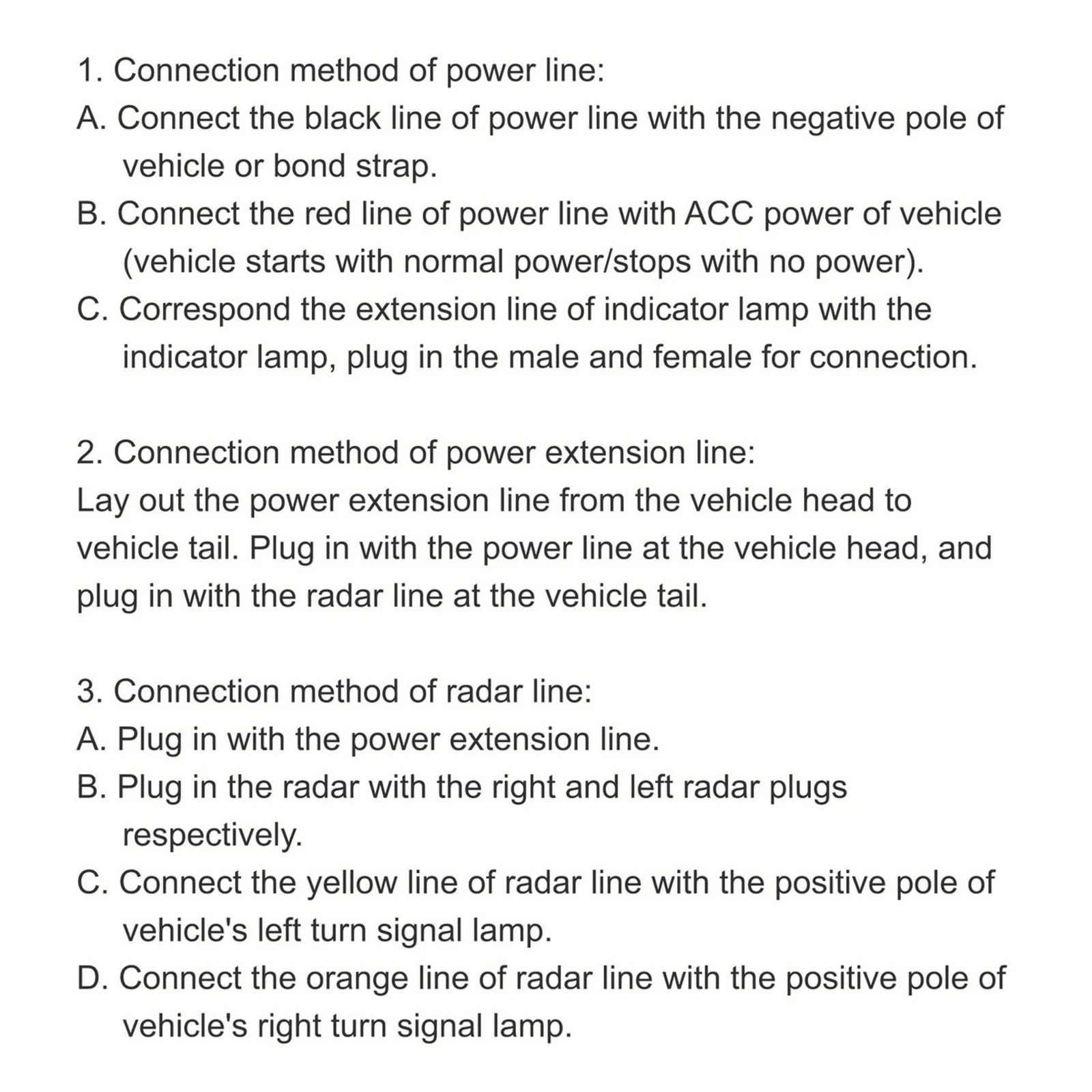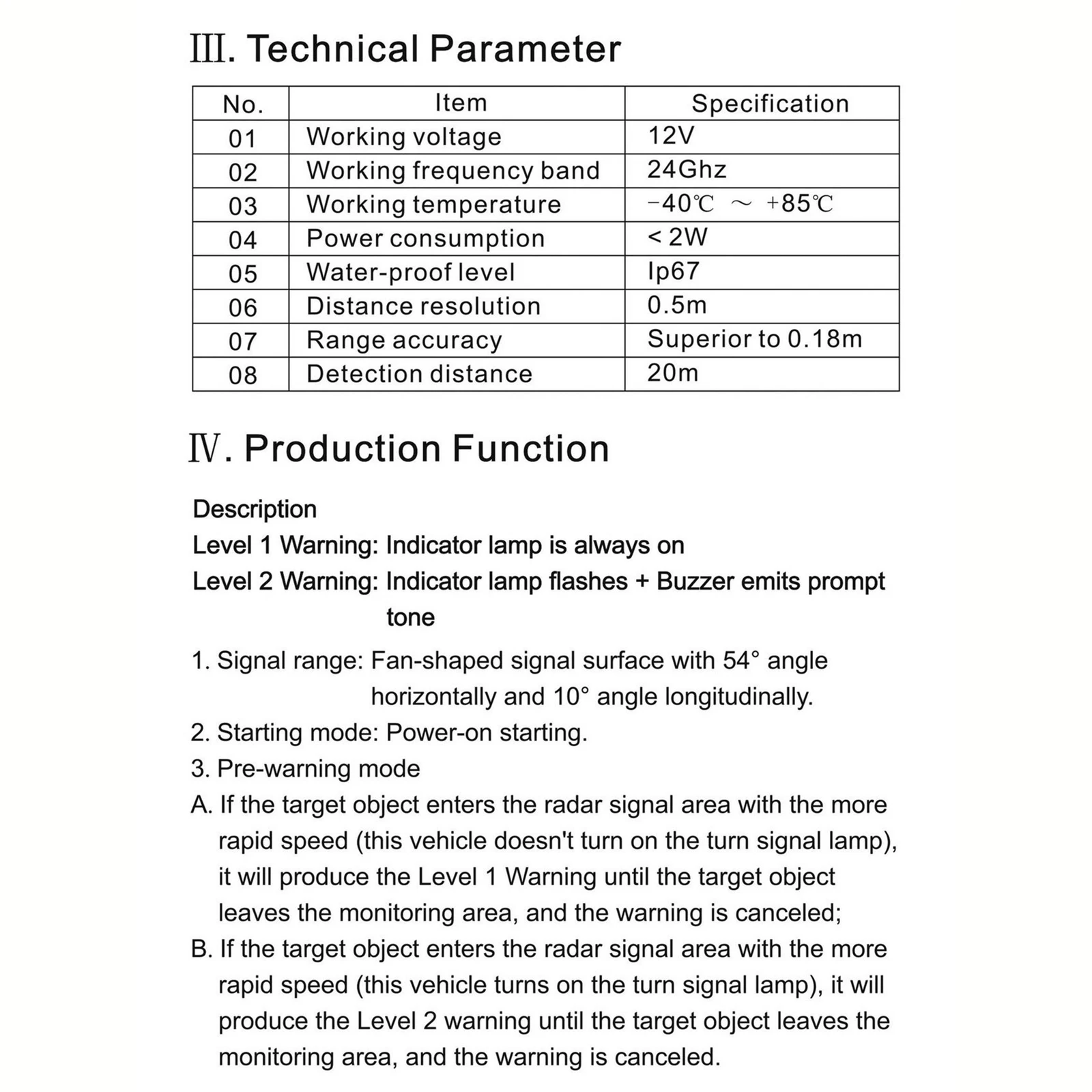 Universal 24Ghz Millimeter Wave Radar BSD Blind Spot Detection System Horizontal 65.61ft Vertical 13.12ft Change Lane SaferProduct introduction:This system product can warn the dangerous targets in the adjacent lanes. The unique ability of 24Ghz millimeter radar to penetrate smoke, fog and dust can realize all-weather and all-time application, detect the objects in the signal area in real time, and calculate the speed, angle and relative displacement of objects at the same time. It can detect the target within 20M(65.61ft) at the farthest, and finally output the alarm signal, which includes the first-level alarm and the second-level alarm.Product functions explanation:1.After the ACC is powered on, the system can immediately enter the working state after the environmental adaptation test. When the car is turned off, the radar stops working.2.The system is in the first-level early warning state except when the turn signal lamp is turned on, double flashing warning lamp and R reverse gear is engaged.3.When the turn signal is turned on, double flashing warning lights and R reverse gear is engaged, the system is in the second-level early warning state.Level 1 alarm: the reminder light is always on.Level 2 alarm: the warning light flashes+the buzzer sounds.The alarm range is centered on the rear of the car. The lateral distance is X and the longitudinal distance is Y. The left lateral distance of the center is negative, and the right lateral distance of the center is positive.Features:The system is a vehicle auxiliary device that can help the driver to safely change lanes while driving.During driving, when the side and rear vehicles are in danger of colliding with my car, the warning light will light up to remind the driver. If the left/right turn signal is turned on, it will be accompanied by an audible warning.The blind spot detection starts when the car starts. When you open the door, if there are pedestrians, cars and motorcycles on the side, it will be detected and accurately alarmed.The blind spot detection system can distinguish between stationary objects and moving objects. Stationary objects do not alarm. Pedestrians and vehicles in a driving state will sound an alarm when they are detected.When waiting for traffic lights: After parking, the car behind is still, and the blind spot detection system does not alarm.Normal driving: When the car behind is slower than us, there is no danger of collision and there is no warning. Similarly, when we overtake, the speed is faster than the car behind and there is no warning.Specifications:Applicable conditions: Universal (There must be no metal objects in front of the 2 radar signals to block the radar)Operating frequency band: 24GhzElectricity voltage: 12VPower consumption: <2WWorking temperature: -40℃ ~ +85℃/-40℉-185℉Storage temperature: -40℃ ~ +85℃/-40℉-185℉Waterproof level: IP67Distance resolution: 0.5m/1.64ftRange accuracy: Superior to 0.18m/0.59ftDetection range: Lateral distance : 0.3m-4m/0.98ft-13.12ft.Rear side distance: 0.3m-20m/0.98ft-65.61ftDetection range accuracy: ≥96%System alarm accuracy: ≥96%Alarm method: method 1 => LED light turn on.Method 2 => LED flash and buzzer sound.Packing List:Radar*2Power cord*1Power extension cable*1 (length 5m/196.85in)Radar extension cable*1 (length 5m/196.85in)Warning light extension cable*2 (the length is 4m/157.48in respectively)Warning light*2 (lengths are 270mm/10.62in respectively)Mounting bracket*2Buzzer*1Cable ties*a fewAngle ruler*1Adhesion promoter*2Adhesive*2User manual*1Package box*1Note:It is recommended that the installation be carried out by professionals.The installation angle of radar will affect the detection distance and effect. Please install it strictly according to the instructions.Light shooting and different displays may cause the color of the item in the picture a little different from the real thing. The measurement allowed error is +/- 10-30mm.