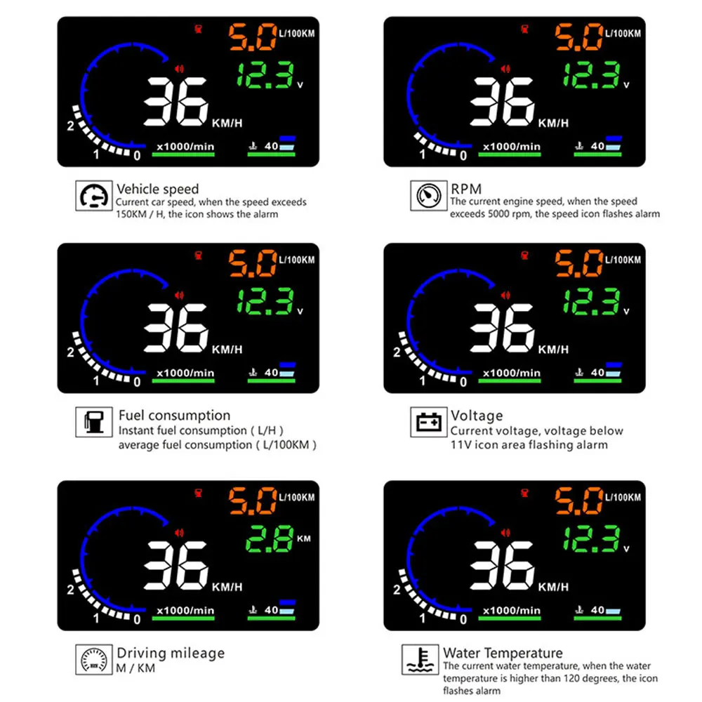 A8 OBD2 HUD Car Head Up Display LED Windshield Projector Speed Fuel Warning Voltage Alarm Speed Water Temp Data Diagnostic ToolA8 Head-up display :HUD short for Head Up Display.It displays driving data on the car windshield such as speed,RPM,water temperature,voltage,single mileage etc;avoiding drivers unsafely because of watching the instrument while driving.Drivers can read the driving information instantly, and always keep the best state on the way with HUD.1.Light sensor:Automatically adjust the brightness according to the environment2.Rotational speed(RPM): the rotational speed of the engine.3.Alarm icon panel: From left to right→Shift reminder, over speed alarm, engine fault, fatigued driver reminder, buzzer.4.Speed: Driving speed5.Rotational speed units: the units of rotational speed6.Unit mark: KM/H= Kilometers/hour, MPH= Miles/hour, RPM=rotations per minute 7.Water temperature:Display the car's tank temperature 8.Secondary Alarm icon panel: From left to right→High water temperature temperature alarm, battery voltage alarm, over-speed alarm9.Unit mark: Degrees (Celsius ℃ or Fahrenheit °F), KM = Kilometers, V = Voltage, M = Miles10. Multi function display: Voltage, Mileage, Water temperature.11. Fuel consumption unit :L/100km = Liter/100 kilometers, L/H = Liter/hour12. Fuel consumption datas13. Fuel consumption iconPackage Include:1 x Head Up DisplayNotes:OBD2 model can work for OBD2 gasoline vehicles produced after 2004 in USA, and OBD2 gasoline vehicles produced after 2008 in other countries.