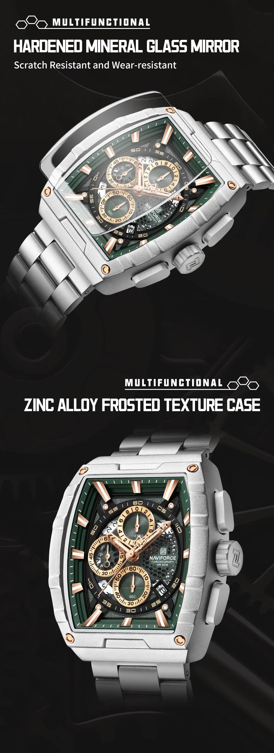 Model: NAVIFORCE NF8066Movement:Quartz Chronograph MovementDial Diameter: 44mmCase Thickness: 15mmBand Length: 240mmBand Width: 26mmProduct Weight: 168gGender: Men Watch & Male Watches & Relogio MasculinoStyle: Fashion Watch & Business Watches & Sport WristwatchDial Window Material Type: Hardened Mineral GlassBand Material Type: Stainless steel strapClasp Type: folding claspFeature:Time, 30M Water Resistant,Date DisplayProducts include: original watch * 1,warranty card * 1, instruction *1We support direct shipping and wholesale